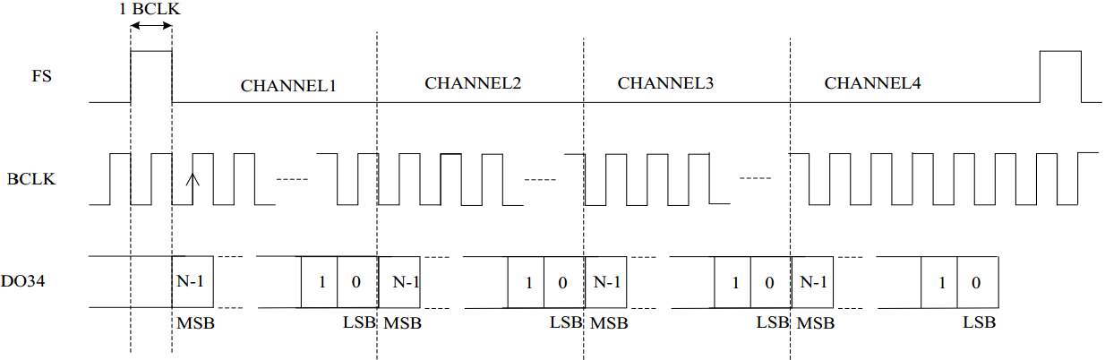 FSYNC的频率等于音频的采样率(例如44.1 kHz,48 kHz等)。Frame每次传输包括所有声道的数据。PCM采样音频数据量化深度一般在16-32bit(最常见为16/24bit)。那么对于8声道,每个声道32bit音频数据,采样率48kHz的系统,TDM的系统时钟速率为:8 × 32 × 48kHz = 12.288 MHz