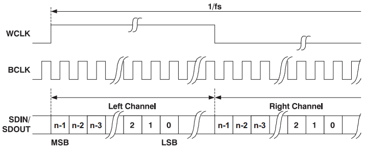 标准左对齐和标准右对齐模式的LRCK/WS高低电平对应的左右声道与标准I2S模式的规定恰好相反!标准左右对齐LRCK/WS高电平对应左声道,LRCK/WS低电平对应右声道;而I2S低电平对应左声道,LRCK/WS高电平对应右声道!