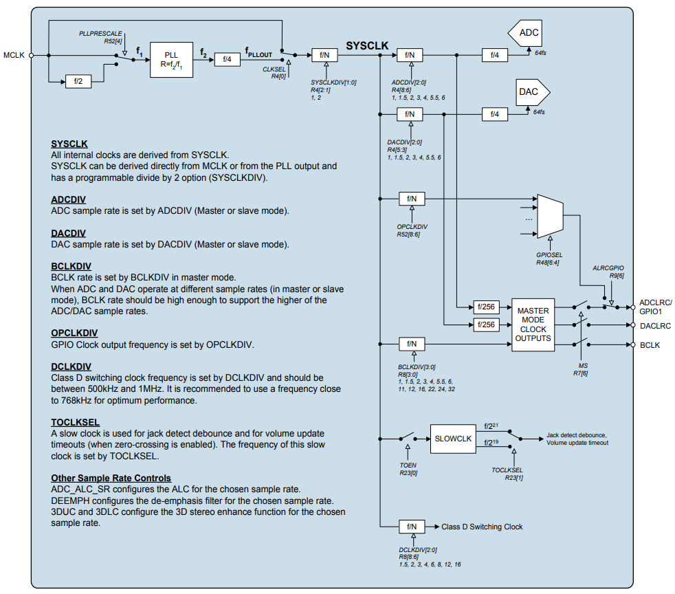 在I2S/PCM接口的ADC/DAC系统中,除了SCK和WS外,CODEC经常还需要控制器提供MCLK (Master Clock),这是由CODEC内部基于Delta-Sigma (ΔΣ)的架构设计要求使然。其主要原因是因为这类的CODEC没有所谓提供芯片的工作时钟晶振电路。它需要外部的时钟提供内部PLL。