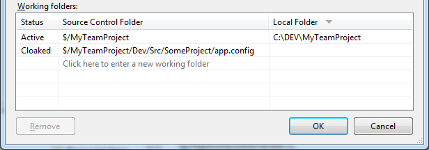 Cloakedand enter the full server path of the file you want to cloak. (E.g.:$/MyTeamProject/Dev/Src/SomeProject/app.config)