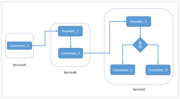 服务A是一个简单消费API接口其和服务B中Provider_1组成了一个业务1,即两个相互之间可以干成一件完整的事。若服务B中不能满足业务需要,服务B由依赖于服务C才能实现一个完整的业务,那么服务B此时在业务2中充当消费者的角色。更为复杂的情况是服务C中由于逻辑的不同,需要使用第三个业务或者第四个业务,此时就会有更多的服务纳入其中。以此类推,一个复杂的业务将会串联或者并联很多服务,服务之间的管理就变得尤为重要。服务中心的服务治理功能主要就是做这部分工作。