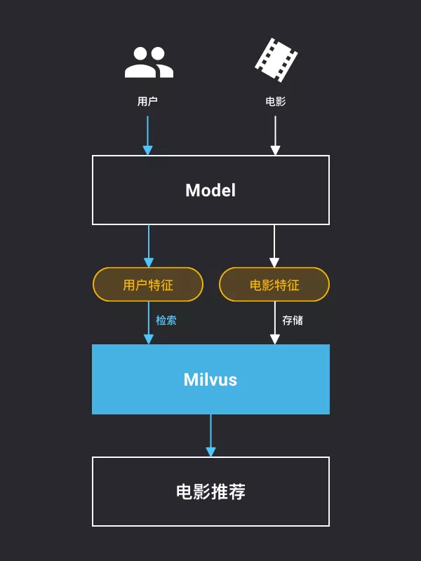 milvus.search_vectors做相似度检索,返回该用户与电影相似度最高的结果。