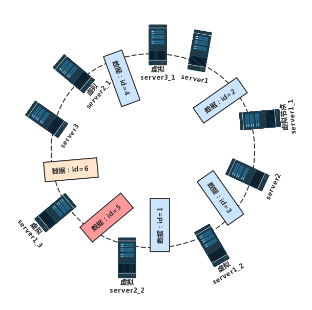 落到虚拟节点上的数据都会存到对应的物理服务器上,所以通过带虚拟节点的一致性哈希算法后,数据存储结果为:数据id=2、id=3、id=5 的数据都会存储到服务器server1 上,id=1 的数据将会存储到服务器server2 上,数据 id=4、id=6 都会存放到服务器server3上。