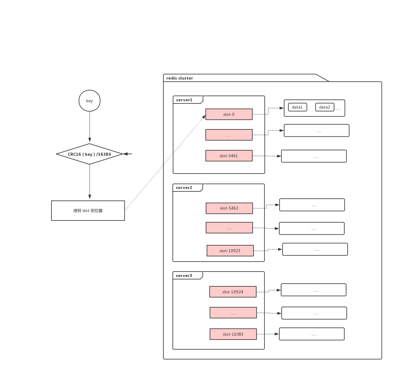 在 redis cluster 中有16384(0~16383)个槽,会将这些槽平均分配到每个 master 上,在存储数据时利用 CRC16 算法,具体的计算公式为:slot=CRC16(key)/16384 来计算 key 属于哪个槽。在我们的集群环境中,一个 key 的存储或者查找过程,可能如下图所示: