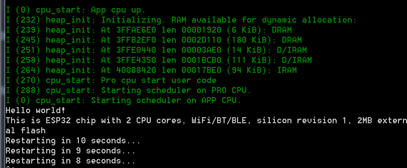 以 hello world 工程为例,编译、下载完成后,可在 cmd 终端看到如下打印: