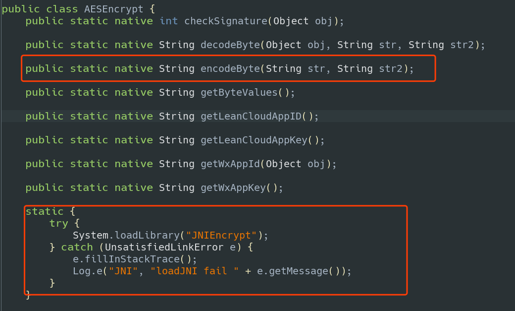 我们需要逆向app,这里不细说如何在app中寻找加载so的类。如下图,encodeByte是该app调用native层加密的入口,loadLibrary是java加载so的方法,这个类就是上述代码中填写的。