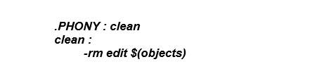 这两个实现有两点不同:① 通过“.PHONY”特殊目标将“clean”目标声明为伪目标。避免当磁盘上存在一个名为“clean”文件时,目标“clean”所在规则的命令无法执行。② 在命令行之前使用“-”,意思是忽略命令“rm”的执行错误。这样的一个目标在Makefile中,不能将其作为终极目标(Makefile的第一个目标)。因为我们的初衷并不是当你在命令行上输入make以后执行删除动作。而是要创建或者更新程序。在我们上边的例子中,就是输入make以后要需要对目标“edit”进行创建或者重建。 上例中因为目标“clean”没有出现在终极目标“edit”依赖关系中(终极目标的直接依赖或者间接依赖),所以我们执行“make”时。目标“clean”所在的规则将不会被处理。当需要执行此规则,要在make的命令行选项中明确指定这个目标(执行“make clean”)。