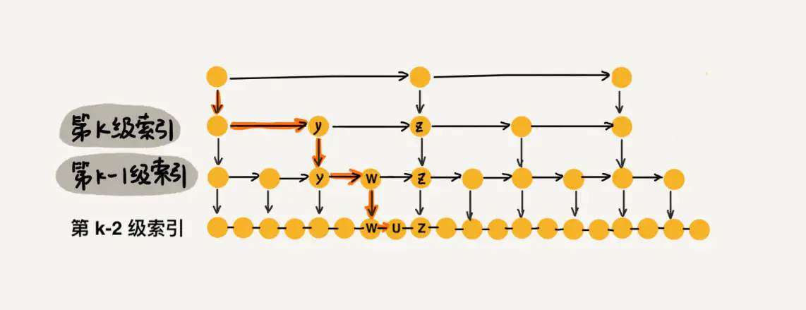 图中所示,现在到达第 k 级索引,我们发现要查找的元素 x 比 y 大比 z 小,所以,我们需要从 y 处下降到 k-1 级索引继续查找,k-1级索引中比 y 大比 z 小的只有一个 w,所以在 k-1 级索引中,我们遍历的元素最多就是 y、w、z,发现 x 比 w大比 z 小之后,再下降到 k-2 级索引。所以,k-2 级索引最多遍历的元素为 w、u、z。其实每级索引都是类似的道理,每级索引中都是两个结点抽出一个结点作为上一级索引的结点。 现在我们得出结论:当每级索引都是两个结点抽出一个结点作为上一级索引的结点时,每一层最多遍历3个结点。