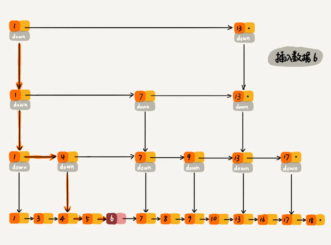 过程大概理解了,再通过一个例子描述一下跳表插入数据的全流程。现在我们要插入数据 6 到跳表中,首先 randomLevel() 返回 3,表示需要建二级索引,即:一级索引和二级索引需要增加元素 6。该跳表目前最高三级索引,首先找到三级索引的 1,发现 6 比 1大比 13小,所以,从 1 下沉到二级索引。