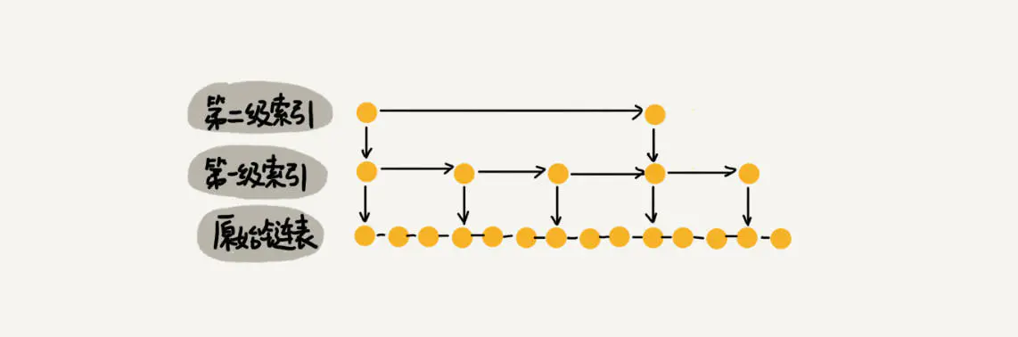 到这里大家应该已经明白了什么是跳表。跳表是可以实现二分查找的有序链表。