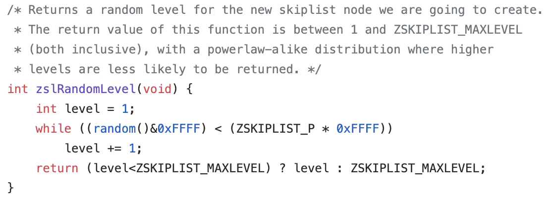 上述代码可以实现我们的功能,而且,我们的案例中晋升概率 SKIPLIST_P 设置的 1/2,即:每两个结点抽出一个结点作为上一级索引的结点。如果我们想节省空间利用率,可以适当的降低代码中的 SKIPLIST_P,从而减少索引元素个数,Redis 的 zset 中 SKIPLIST_P 设定的 0.25。下图所示,是Redis t_zset.c 中 zslRandomLevel 函数的实现: