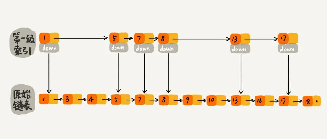 现在我们有个场景,想快速找到上图链表中的 10 这个元素,只能从头开始遍历链表,直到找到我们需要找的元素。查找路径:1、3、4、5、7、8、9、10。这样的查找效率很低,平均时间复杂度很高O(n)。那有没有办法提高链表的查找速度呢?如下图所示,我们从链表中每两个元素抽出来,加一级索引,一级索引指向了原始链表,即:通过一级索引 7 的down指针可以找到原始链表的 7 。那现在怎么查找 10 这个元素呢?