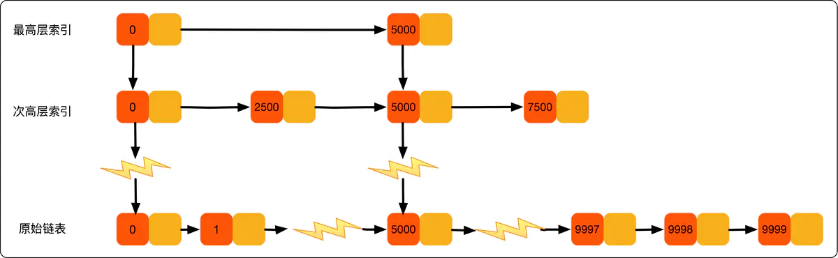 可能同学们会想,从上面案例来看,提升的效率并不明显,本来需要遍历8个元素,优化了半天,还需要遍历 4 个元素,其实是因为我们的数据量太少了,当数据量足够大时,效率提升会很大。如下图所示,假如有序单链表现在有1万个元素,分别是 0~9999。现在我们建了很多级索引,最高级的索引,就两个元素 0、5000,次高级索引四个元素 0、2500、5000、7500,依次类推,当我们查找 7890 这个元素时,查找路径为 0、5000、7500 ... 7890,通过最高级索引直接跳过了5000个元素,次高层索引直接跳过了2500个元素,从而使得链表能够实现二分查找。由此可以看出,当元素数量较多时,索引提高的效率比较大,近似于二分查找。