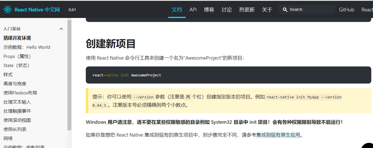 登陆react native官网https://reactnative.cn/docs/getting-started.html