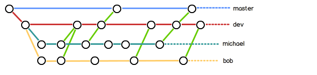 你和你的小伙伴们每个人都在dev分支上干活,每个人都有自己的分支,时不时地往dev分支上合并就可以了。