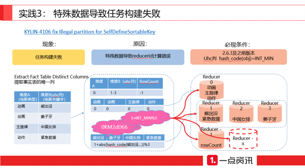 若 UHC 列 Reducer 数不为 3,或该维度起始 ReducerId 不为 1,则该特殊数据可能会被分配到其他任意 Reducer 中,甚至是不存在的 Reducer,从而导致任务在提取事实表的唯一列执行失败,必须找到该数据并剔除才能执行成功。