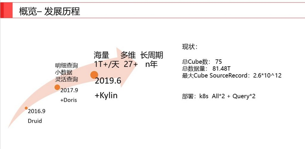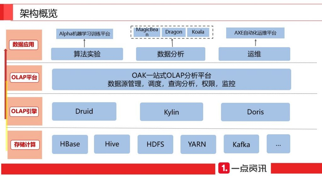 2016 年 9 月开始,一点资讯选择了综合性能优秀的 Druid 来承接大数据部门、算法部门和广告部门的多维分析查询需求。2017 年 9 月,接入刚刚开源的 Doris,承接明细查询和 SQL 分析业务。