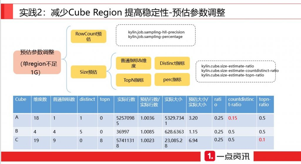 对于 region 划分不合理的情况,我们调整预估参数。Kylin 依据其预估数据两判定生成 HTable region 数,这是因为创建HTable在生成 cuboid 数据之前,无法准确获知真实的数据量。