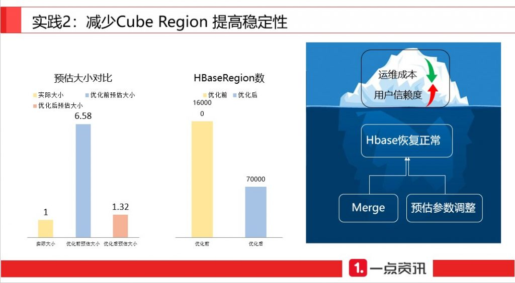 通过 merge 任务和预估参数调整的 region 数量 16 万个降到 7 万个,保证了 HBase 稳定运行。