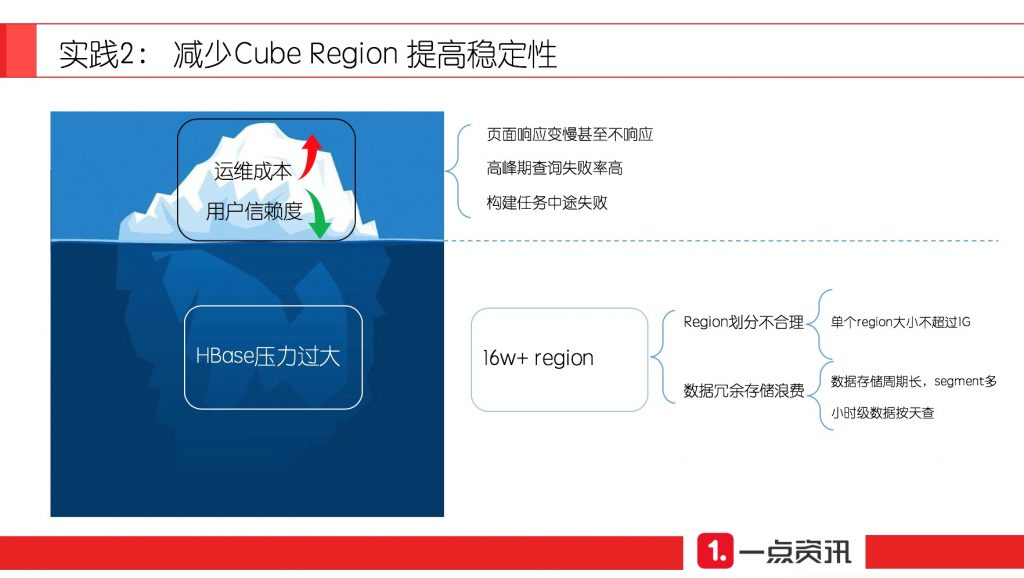 其真正的原因在于 HBase 稳定性降低。当时导致 HBase 稳定性差的一个重要原因是 region 数过多。生产集群的 HBase 总数据量 90 T,但大小 region 数共16 万+,region 划分存在严重浪费。我们发现如下情况: