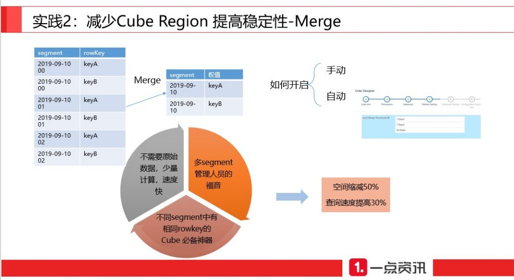 针对数据冗余情况我们使用了 Kylin 的 Merge 功能,Merge会合并不同 segment的cuboid 数据,且不需要依赖原始数据。开启也非常方便,手动地提交一个 merge 任务或者设置 refresh settings 并开启 auto-merge 即可。