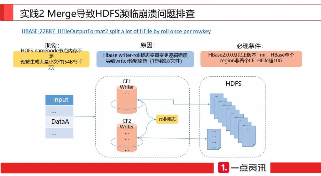 Merge 时,发生了一个意外。某个Merge 任务持续运行 10 小时没有结束,频繁生成大量只有 54B 的小文件,导致我们 HDFS namenode 的节点内存不足。
