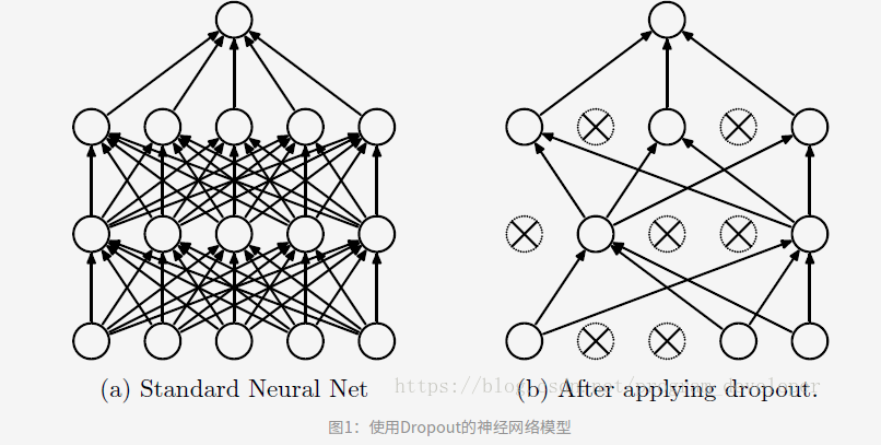 Dropout说的简单一点就是:我们在前向传播的时候,让某个神经元的激活值以一定的概率p停止工作,这样可以使模型泛化性更强,因为它不会太依赖某些局部的特征,如图1所示。