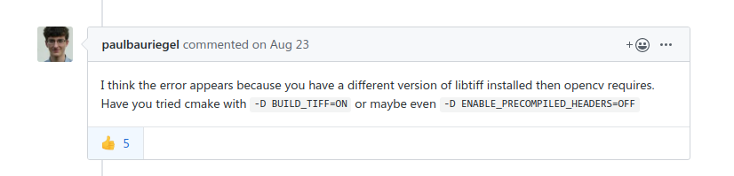 cmake -D BUILD_TIFF=ON -D ENABLE_PRECOMPILED_HEADERS=OFF ..