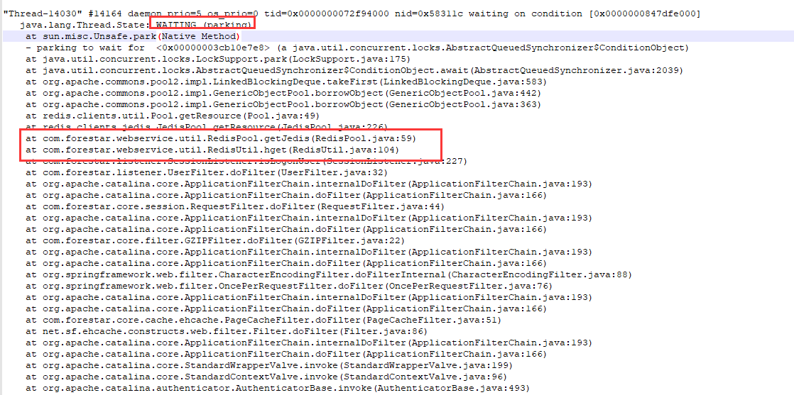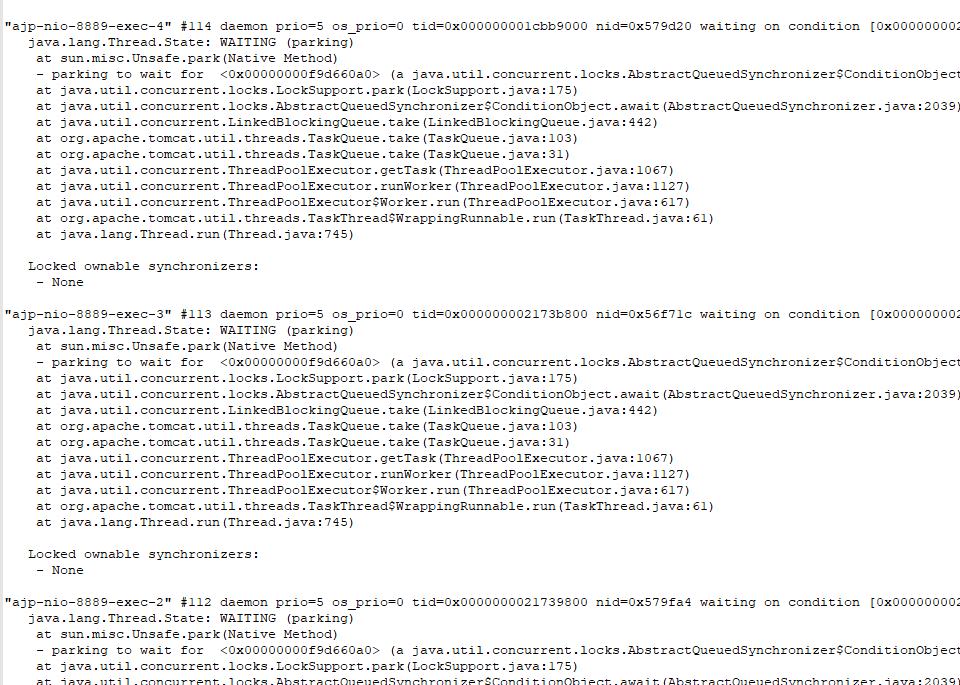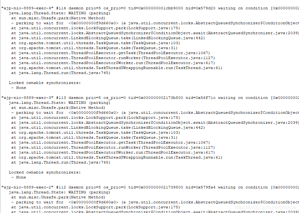 如下面截图所示并没有明显的有关业务代码堆栈输出,但是Tomcat就是阻塞掉了。