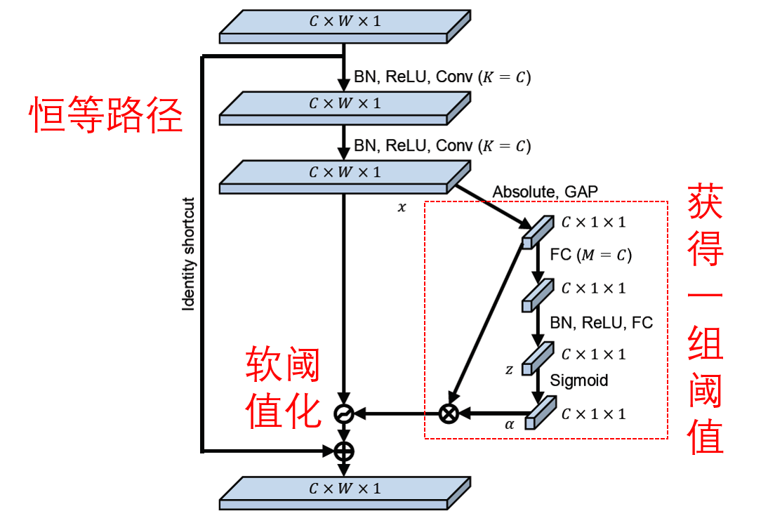 然后,和深度残差网络不同的是,深度残差收缩网络引入了一个小型的子网络,用这个子网络学习得到一组阈值,对特征图的各个通道进行软阈值化。这个过程其实可以看成一个可训练的特征选择的过程。具体而言,就是通过前面的卷积层将重要的特征转换成绝对值较大的值,将冗余信息所对应的特征转换成绝对值较小的值;通过子网络学习得到二者之间的界限,并且通过软阈值化将冗余特征置为零,同时使重要的特征有着非零的输出。