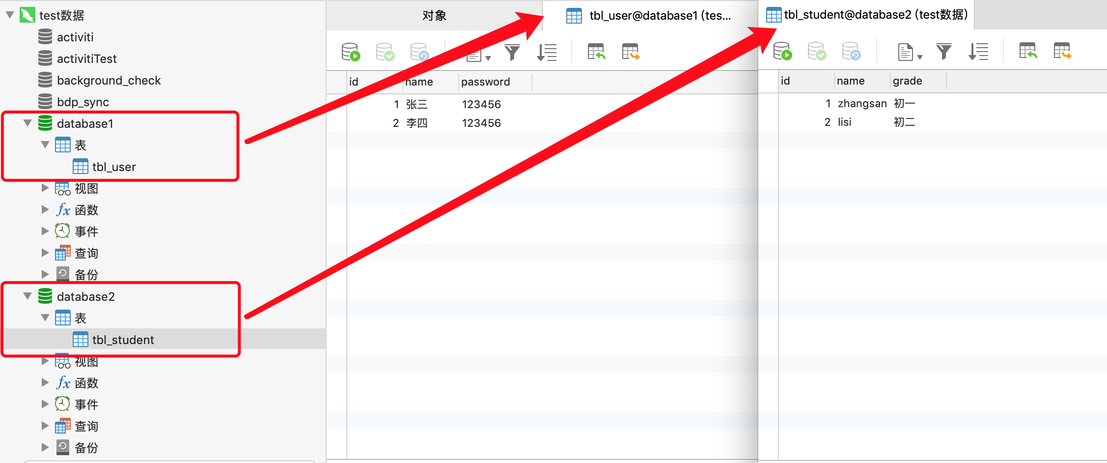 分别创建两个数据库database1、database2,database1中创建tbl_user表,database2中创建tbl_student表,如下图
