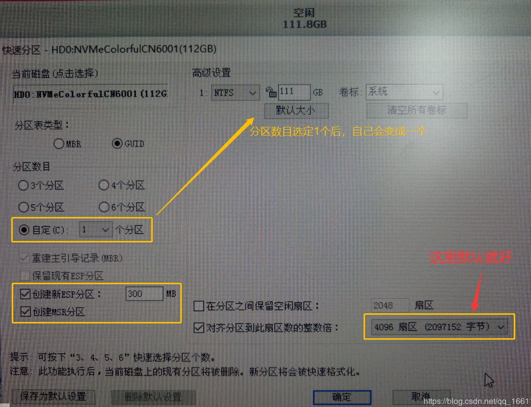 选中固态硬盘,点击左上方的“快速分区”,我是按照下图这样分区(可根据自己实际情况修改):