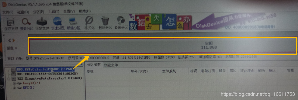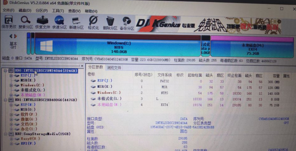 打开PE里的DiskGenius(DG硬盘分区),查看现在电脑里的分区情况:如下示意图