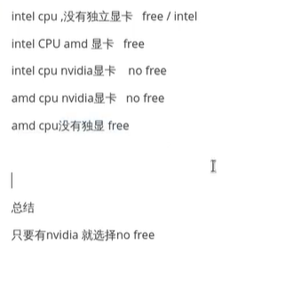 driver选择free还是nofree因电脑配置而异,大家可以参考下面这张图来选择,图片来源,详情参见视频05:45