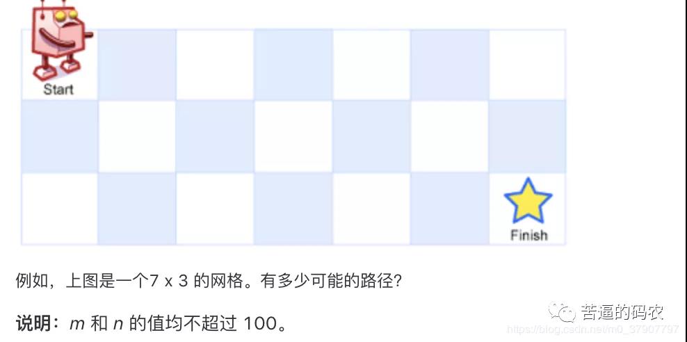 (1) 一个机器人位于一个 m x n 网格的左上角 (起始点在下图中标记为“Start” )。机器人每次只能向下或者向右移动一步。机器人试图达到网格的右下角(在下图中标记为“Finish”)。
