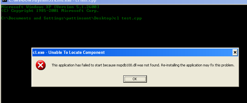 By the way, mspdb100.dll lives in C:\Program Files\Microsoft Visual Studio 10.0\Common7\IDE. But run the shortcut/batch file anyway - it does more than set up the correct path.