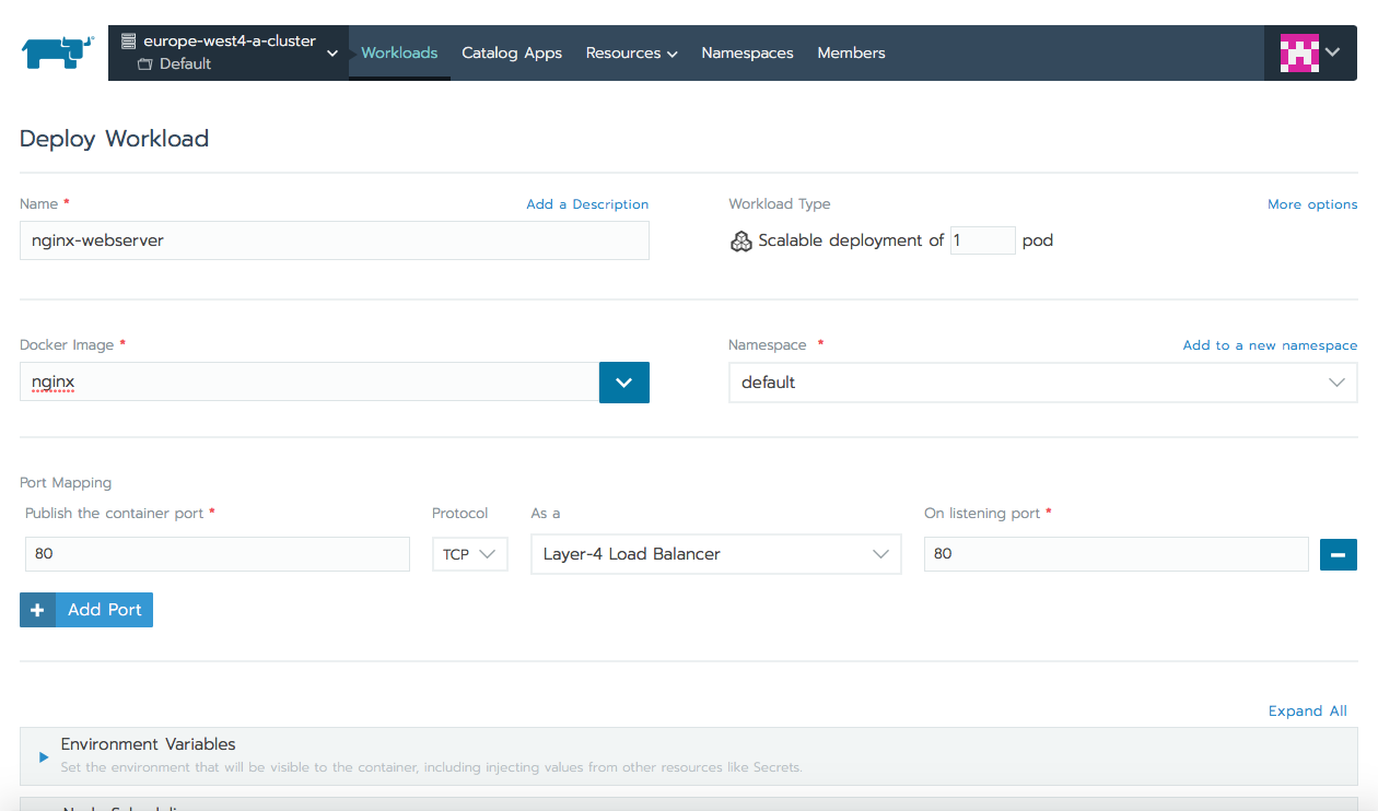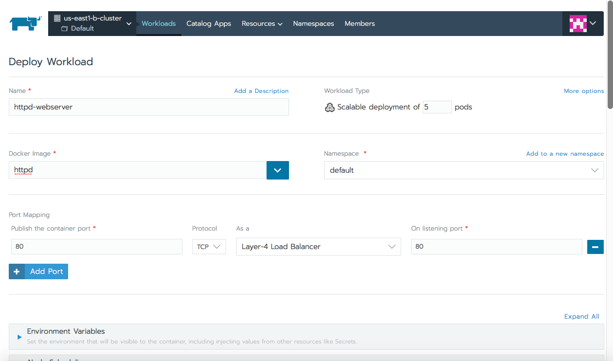 下面继续为两个集群部署工作负载。按顺序选择默认项目; 这将打开Workloads选项卡。单击Deploy,将第一个集群的名称及Docker镜像设置为httpd,第二个集群的设置为nginx,因为我们希望将我们的Web服务器暴露给Port映射区域。选择一个四层负载均衡中的Internet流量。