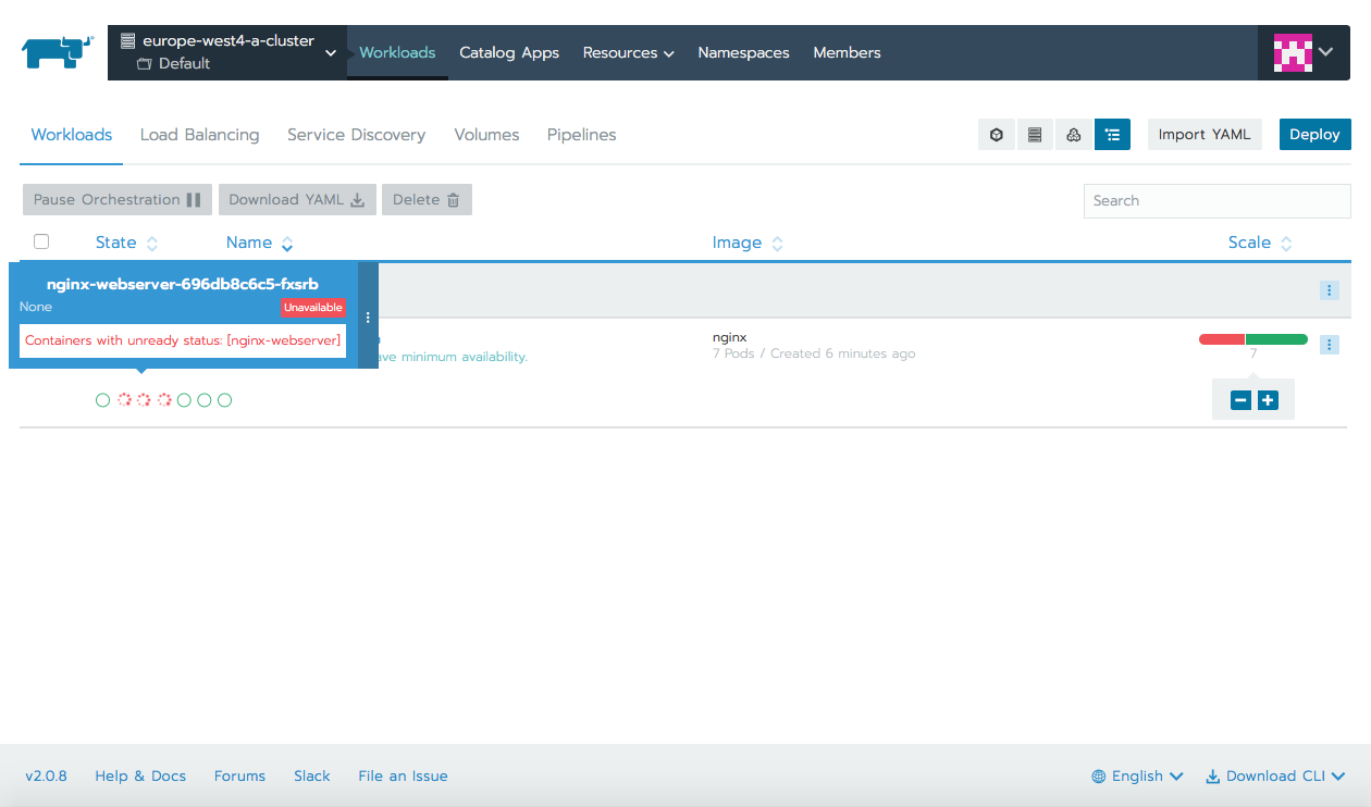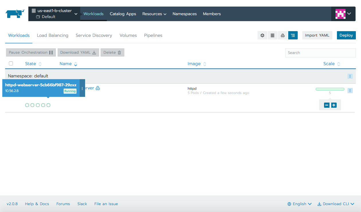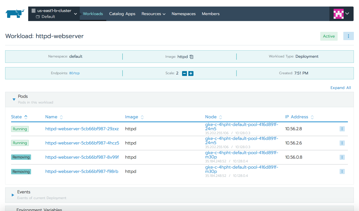 如果单击nginx / httpd工作负载,您将看到Rancher实际上按照Kubernetes的建议创建了一个部署来管理ReplicaSet。您还将看到这个ReplicaSet创建的Pod。