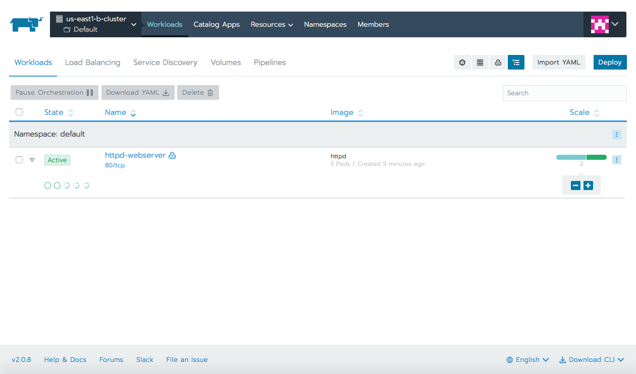 单击Scale列下的“-”(减号图标),可以减少httpd Pod。我们很快就看到Pod数量减少了。