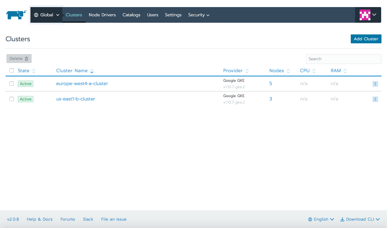 让我们检查一下Global选项卡,这样我们就可以对Rancher正在管理的所有集群有一个全局的了解。