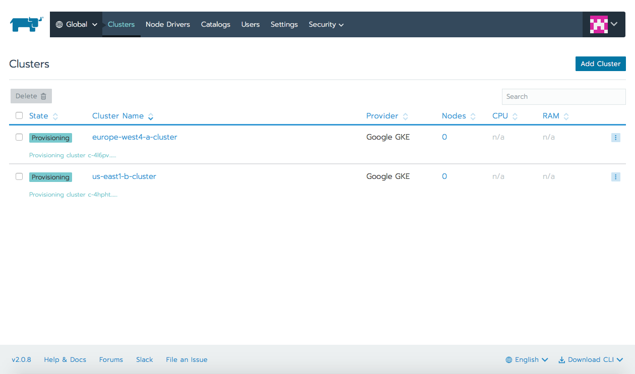在Global选项卡中,我们可以看到所有可用的集群及其状态。从Provisioning状态开始,集群准备好后,状态会变成Active。