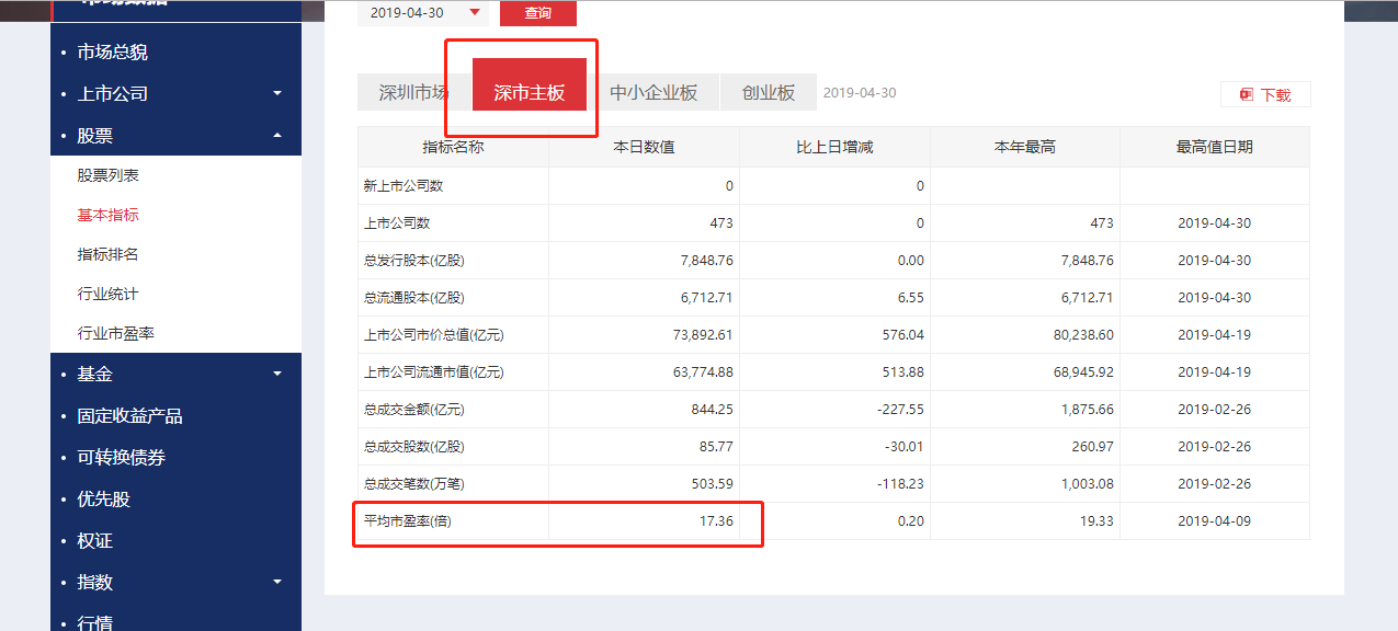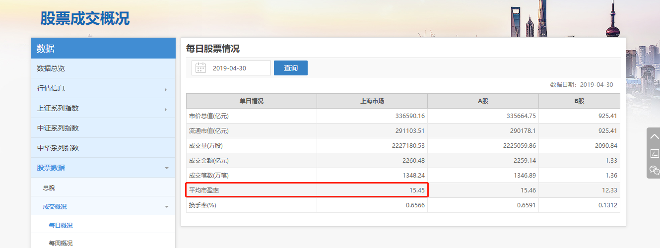 进入页面,由于深圳证券交易所包含主板、中小板、创业板并且后两者估值普遍偏高,我们只看主板市盈率