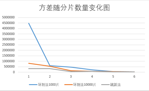 | 分片数量\方差 | 环割法1000片 | 环割法10000片 | 跳跃法 |