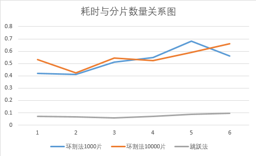 | 分片数量\耗时 | 环割法1000片 | 环割法10000片 | 跳跃法 |