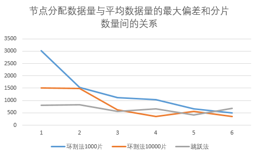 - 在分片数量少的时候,跳跃法的均衡性最好,环割法相对最差。