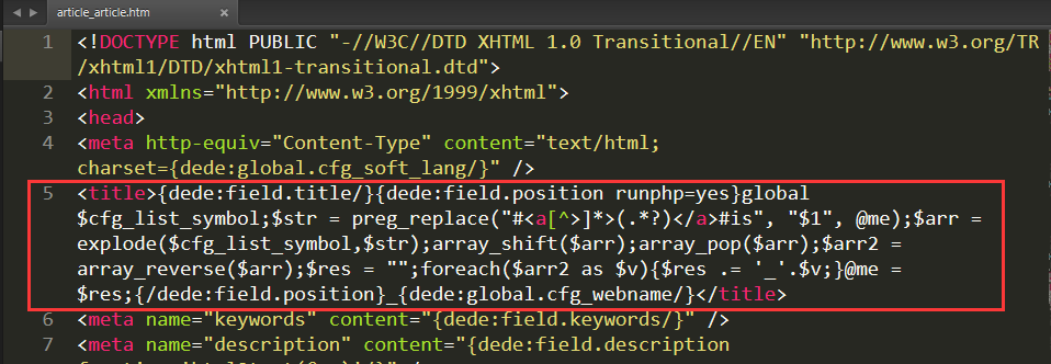 <title>{dede:field.title/}{dede:field.position runphp=yes}global $cfg_list_symbol;$str = preg_replace("#<a[^>]*>(.*?)</a>#is", "$1", @me);$arr = explode($cfg_list_symbol,$str);array_shift($arr);array_pop($arr);$arr2 = array_reverse($arr);$res = "";foreach($arr2 as $v){$res .= '_'.$v;}@me = $res;{/dede:field.position}_{dede:global.cfg_webname/}</title>