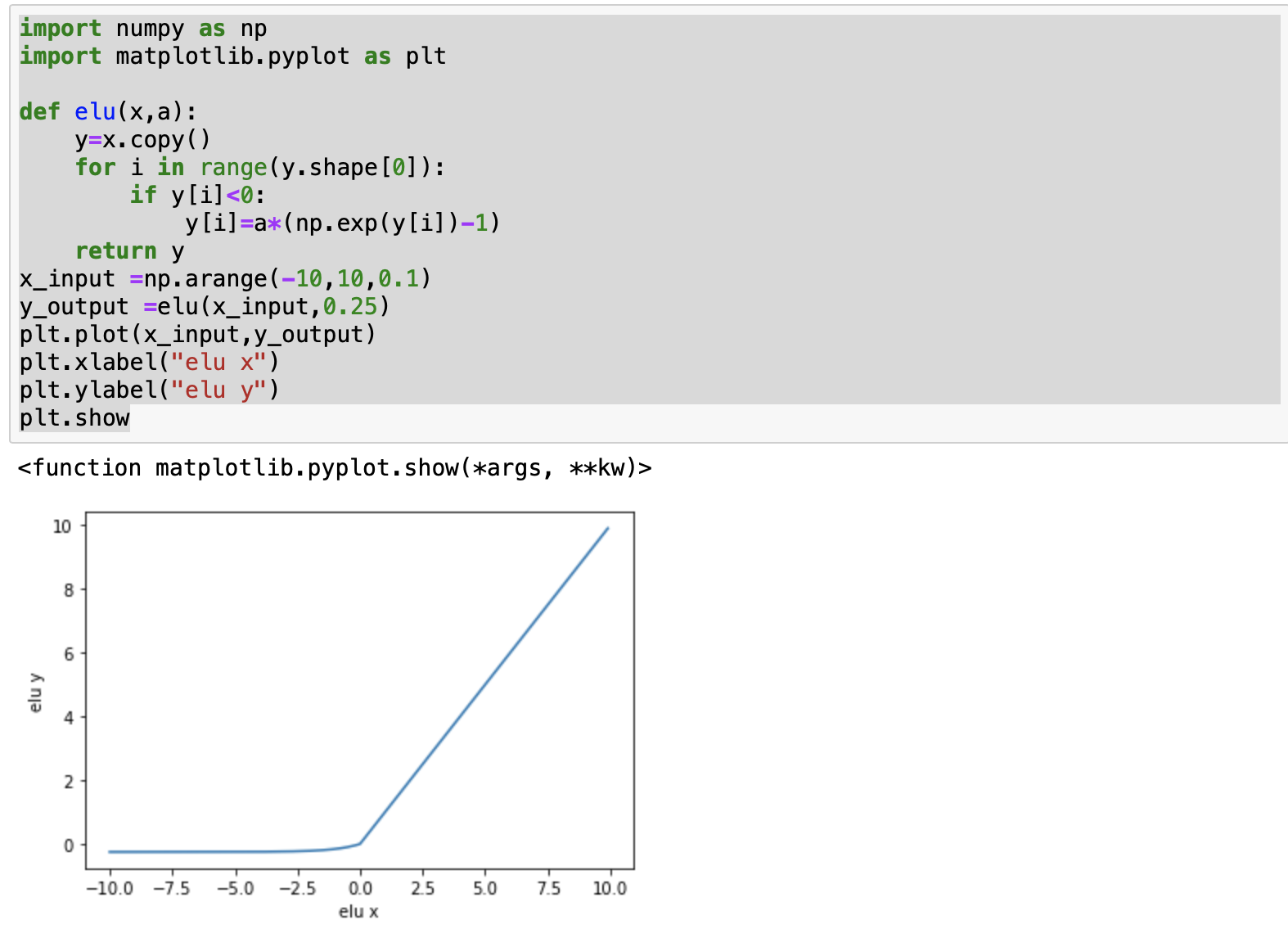 ELU函数是针对ReLU函数的一个改进型,相比于ReLU函数,在输入为负数的情况下,是有一定的输出的,这部分输出还有一定的抗干扰能力。可以消除ReLU死掉的问题,但它还有梯度饱和和指数运算的问题,需要我们面对。