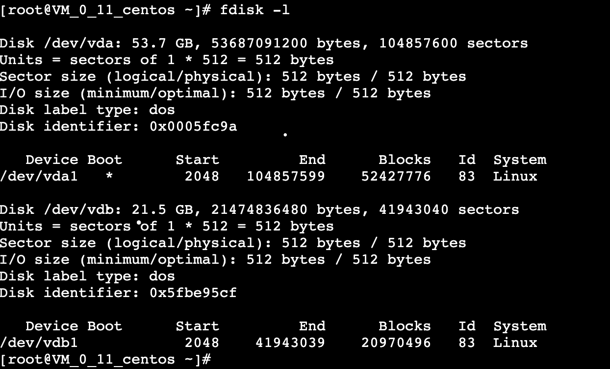 当我们再来查所有分区时,用fdisk -l 命令就会多了一个主分区,/dev/vdb1;如下图: