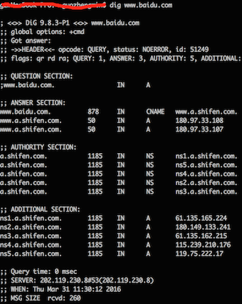 在Linux系统还可以用dig命令查询DNS的解析过程,如下图:(dig常用命令)