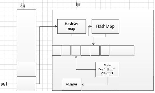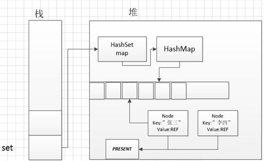 可以看出来HashMap的key分别为”张三”,”李四”,“王五”, 因为HashSet用不到value,他们的value都是一样的指向同一个地方。继续往下看:System.out.println(set.size());
